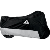 Heavy-duty, 100% waterproof motorcycle cover with heat-resistant panels, Perma-Venting® airflow, reflective strips, soft windshield liner, and a snug elastic hem. Packs into a compact compression bag.