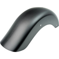 Pre-preg 3K full twill carbon fiber rear fender with vacuum-bagged, autoclave-cured construction and bolt-on installation; requires custom taillight and license plate mounting.