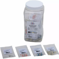 No soldering gun required; low-heat solder activates with a heat gun to create a watertight shrink seal. Packs come in a clear jar with barcode-labeled packs for easy counter or service use.