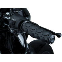 Durable knurled rubber sleeves with an embossed logo around machined billet grips for comfort and style. Made in the USA.
