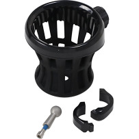 Universal handlebar drink holder with contoured net, infinite ball-mount adjustment, vibration-reducing ring, and soft net that protects paint. Additional mounts available.