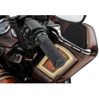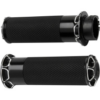 Diamond knurled rubber grips with billet aluminum accents for improved traction and control.