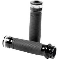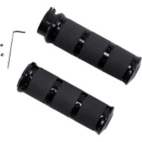 Durable knurled rubber sleeves with an embossed logo around machined billet grips for comfort and style. Made in the USA.