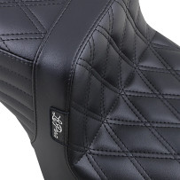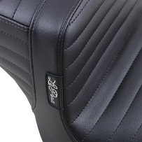 Comfort-oriented seat for rider and passenger with a whipped-up tail, molded foam, and a powder-coated steel base. Made in the USA.