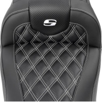 Comfort-focused one-piece seat with front and rear SaddleGel™, tall lumbar support, split-cushion design, and ventilated leather for long rides.
