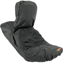 Durable black rain cover for Low Profile Touring and Double Bucket seats; folds into sewn pouch and includes nylon tie with barrel-lock adjusters.