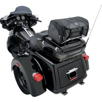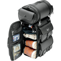 Quick-mount sissy bar bag with included roll bag and raincover. Fully adjustable mounting, multiple pockets, internal shelf, and rigid back support.