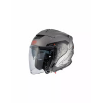 Open-face helmet with lightweight shell, two-size EPS liner, retractable inner visor, removable washable interior, and micrometric quick-release strap.