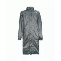 Traje de lluvia ligero que se coloca sobre la ropa o el equipo, llega por debajo de la rodilla, con cremalleras laterales, cuñas y detalles reflectantes.